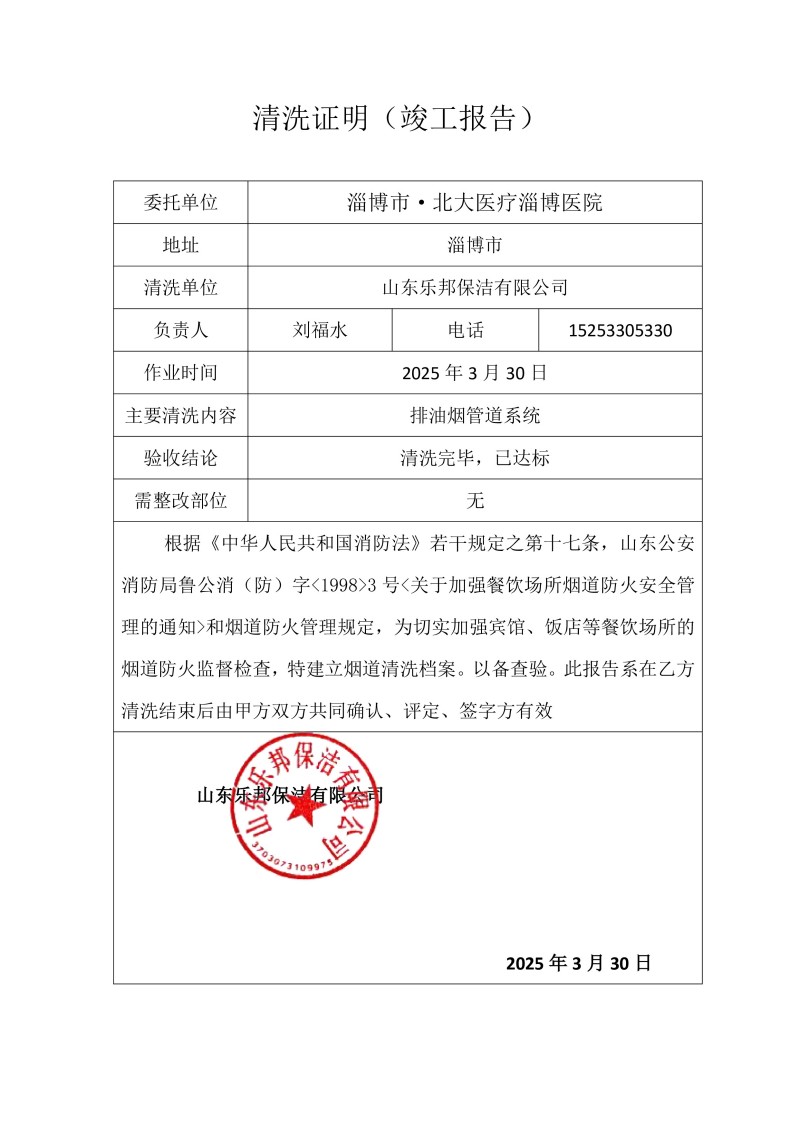 淄博市·北大醫(yī)療淄博醫(yī)院清洗報(bào)告25.3.30